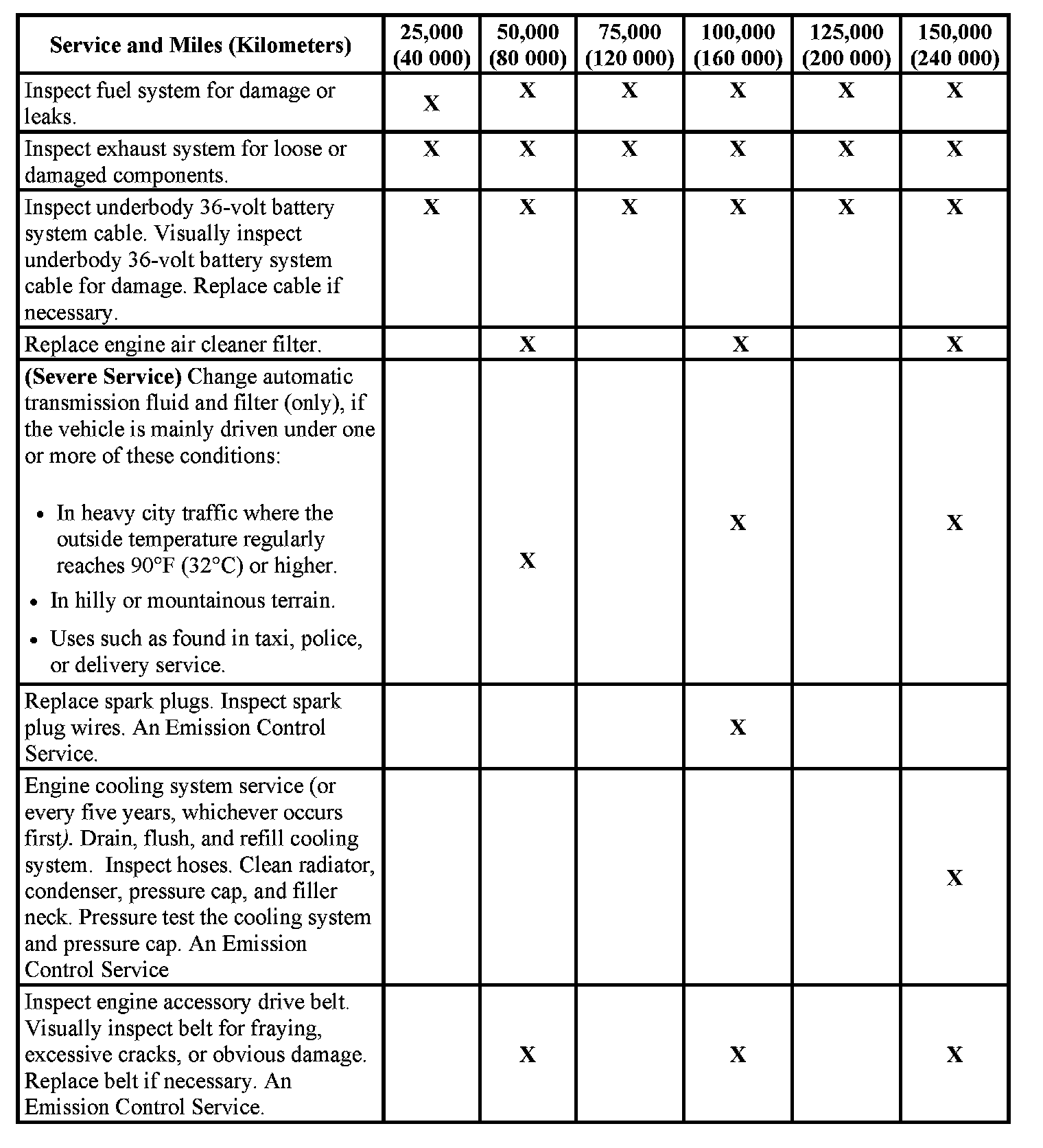 service (I or II) after the indicated miles (kilometers) shown for each item.