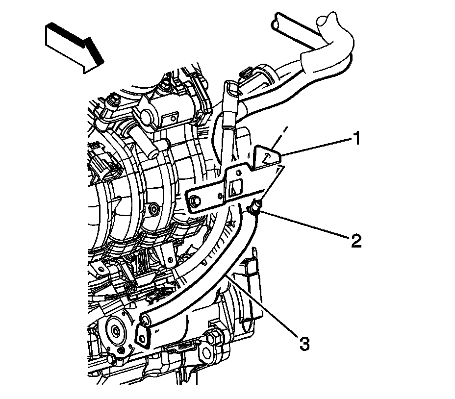 6. Remove the positive battery cable clip (2) from the oil level indicator tube bracket (1).