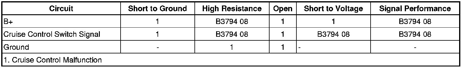 Ignition ON, observe the cruise control indicator while applying the cruise ON/OFF switch. The indicator should turn ON and OFF accordingly with the applied switch.
