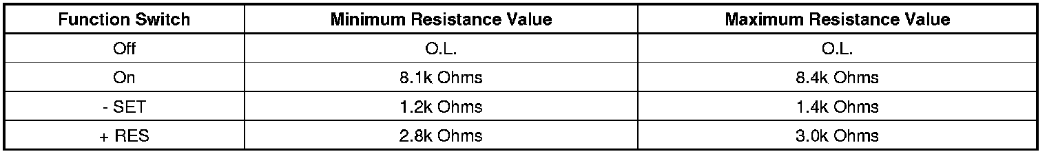 2. Cruise control switch ON, measure the resistance between terminal 4 and terminal 5 while individually activation and holding each cruise control function switch and compare the resistance reading to the values in the table below.