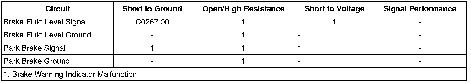 The instrument panel cluster (IPC) sees the brake fluid level switch input grounded and illuminates the Red Brake Warning indicator. The body control module (BCM) sees the park brake switch input grounded, it sends a serial data message to the IPC requesting illumination of the Red Brake Warning indicator.