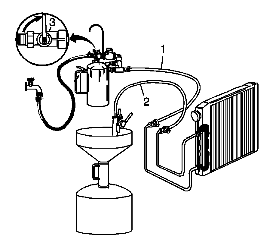 4. Turn the SA 9165T - line flusher water supply valve (3) to the ON position and allow water to flow through the oil cooler and lines for 10 seconds to remove any remaining transmission fluid. If water does not flow through the oil cooler and lines, the cause of the blockage must be diagnosed and the plugged component must be repaired or replaced. Continue with the cooler flushing and flow check procedure once the blockage is corrected.