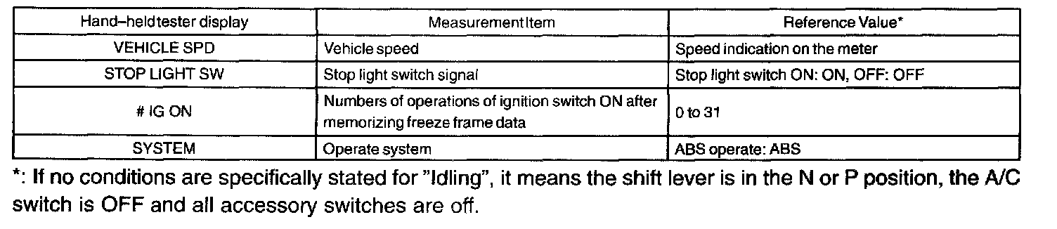 FREEZE FRAME DATA OF ABSa. The vehicle (sensor) status stored during ABS operation or at the time of an error code detection can be displayed on the hand-held tester.