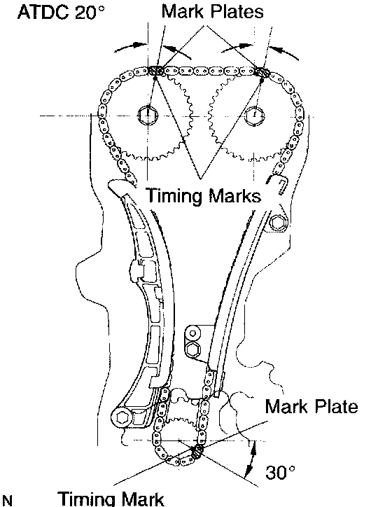 a. After setting the crankshaft at ATDC 40 to 140°, set cams of intake and exhaust timing sprockets at ATDC 20° and then reset the crankshaft at ATDC 20°.