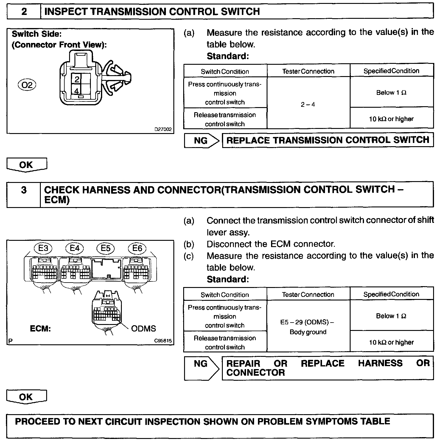 CIRCUIT DESCRIPTIONThe O/D main switch (transmission control switch) is a momentary type switch. When pressing the O/D main switch, the O/D OFF indicator light lights up and the ECM prohibits shifting into O/D, and when pressing it once again, the O/D OFF indicator light goes off and the ECM allows shifting into O/D. Turning the IG switch OFF will reset the O/D OFF indicator light.
