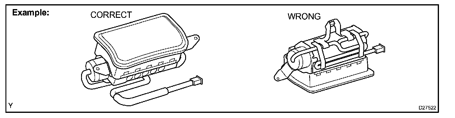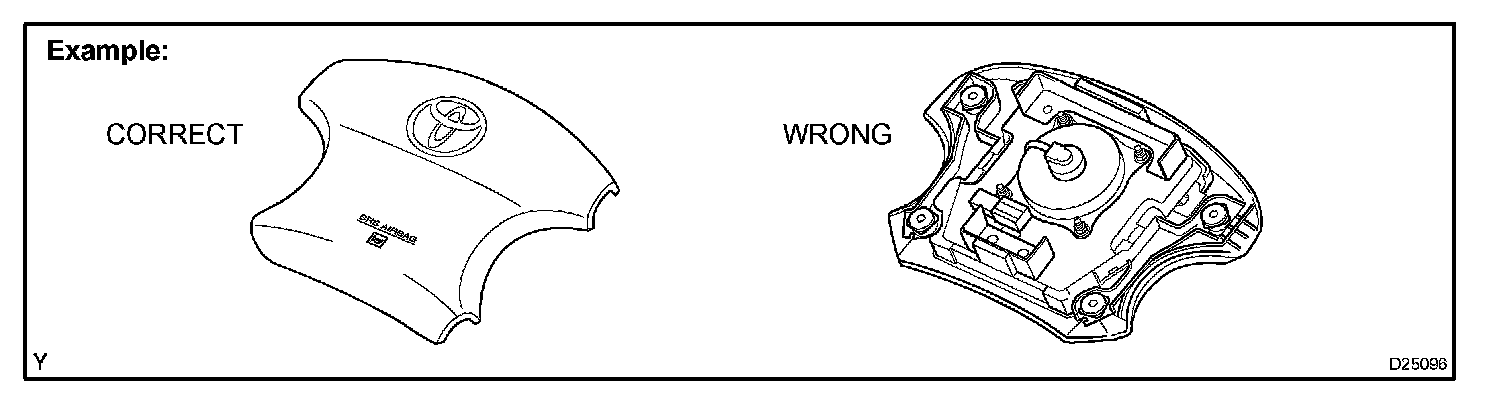 1. Always place a removed or new front seat airbag assembly with the airbag inflation direction facing upward. Placing the airbag assembly with the airbag inflation direction facing downward could cause a serious accident if the airbag deploys.