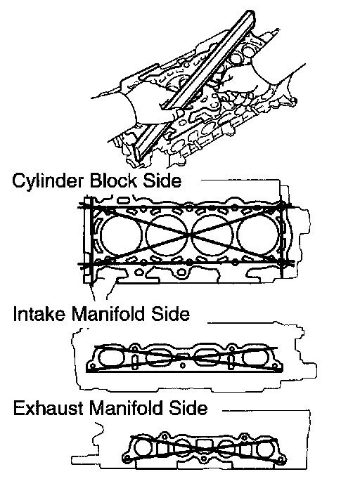 a. Using a precision straight edge and a feeler gauge, measure the surface contacting the cylinder block and the manifolds for warpage.