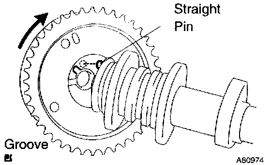 b. Turn the camshaft timing gear assembly clockwise while pushing it lightly towards the camshaft. Push further at the position where the pin fits into the groove.