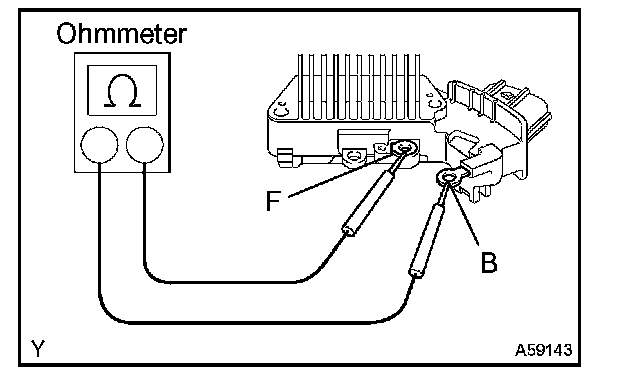 1. Using an ohmmeter, connect one tester probe to the positive (+) terminal and the other to each rectifier terminal.