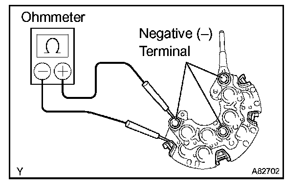 1. Using an ohmmeter, connect one tester probe to each negative (-) terminal and the other to each rectifier terminal.