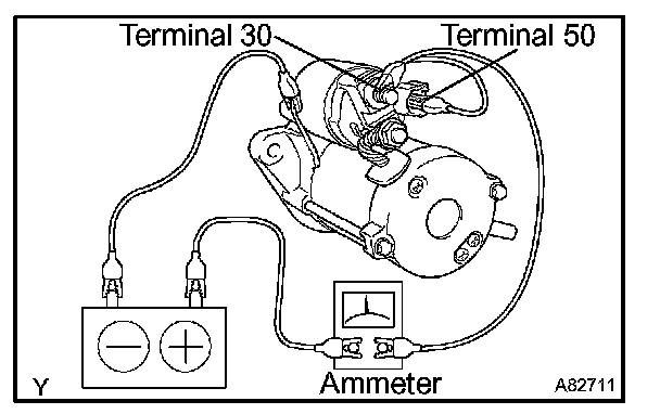 3. Connect the battery and an ammeter to the starter as shown in the illustration.