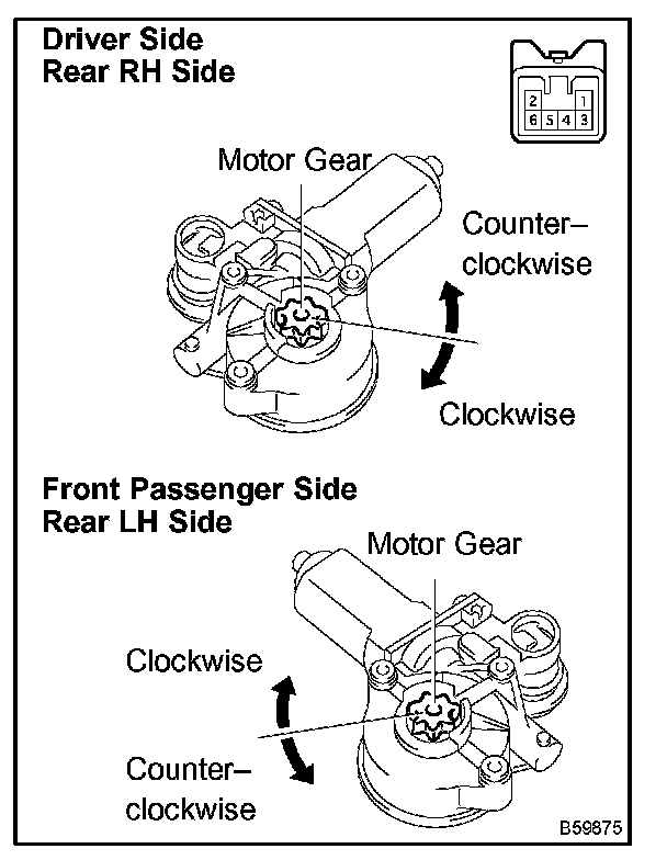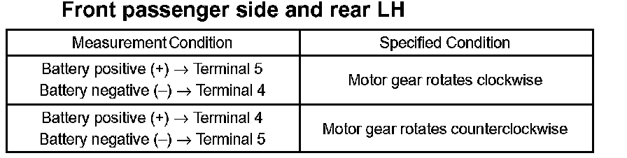 - The driver side and rear RH regulator motors should be inspected using the same procedure.