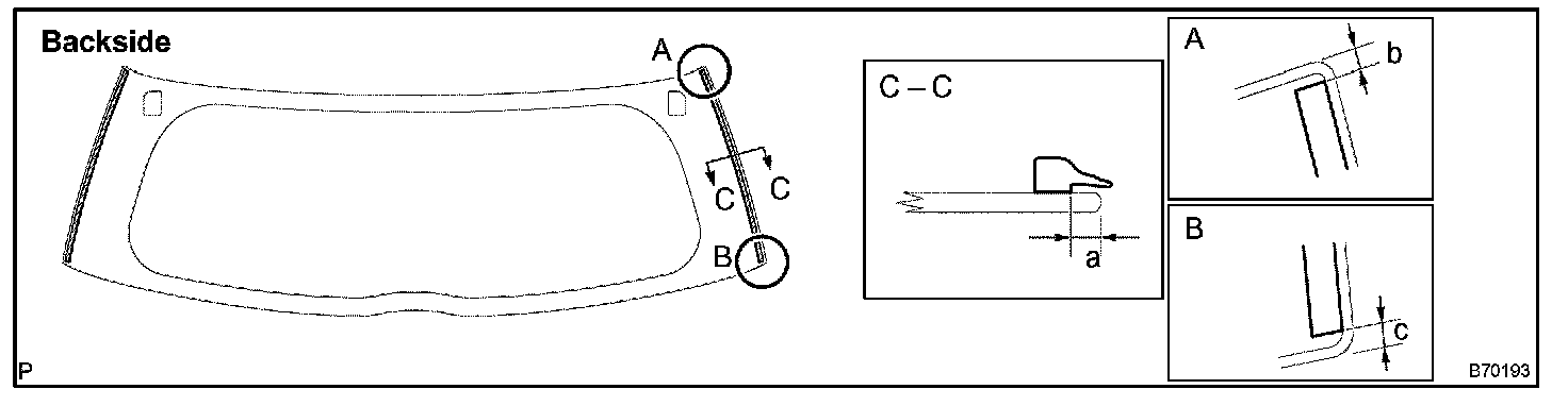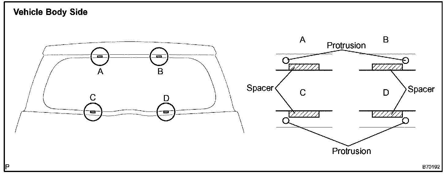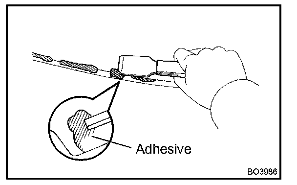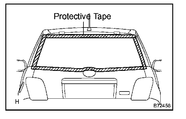1. Hold the back window glass in place securely with tape or equivalent to the vehicle body until the adhesive has hardened.