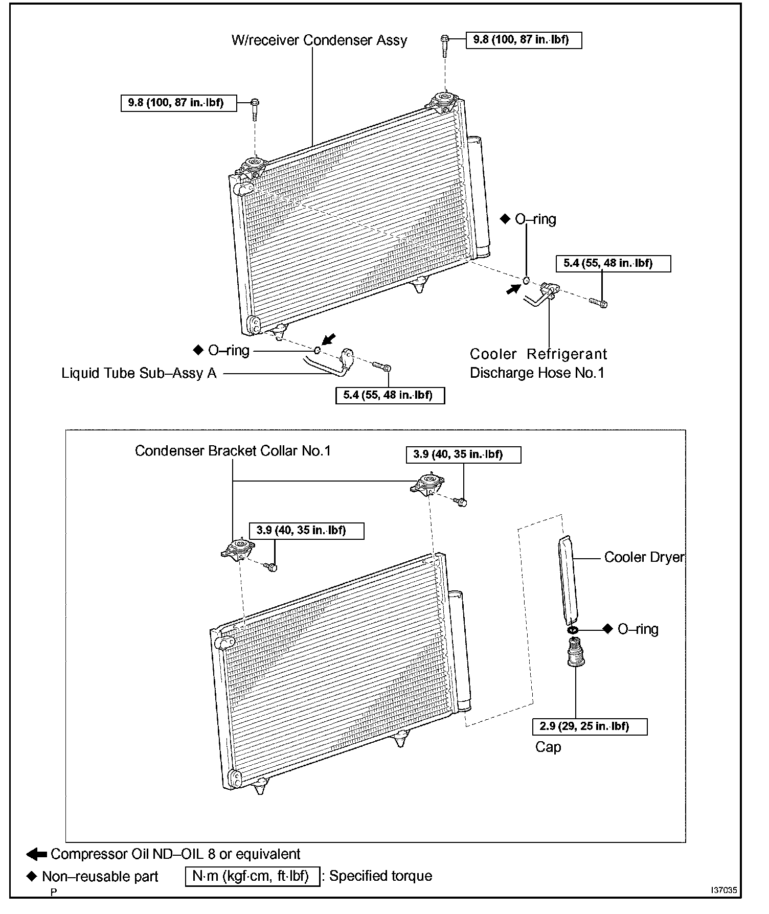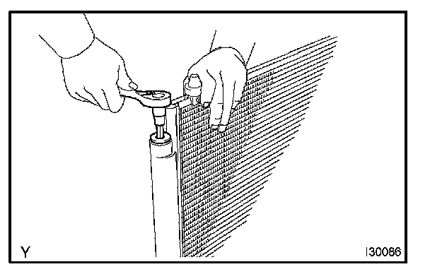 d. Install the cooler refrigerant discharge hose No.1 to the w/receiver condenser assy with the bolt.