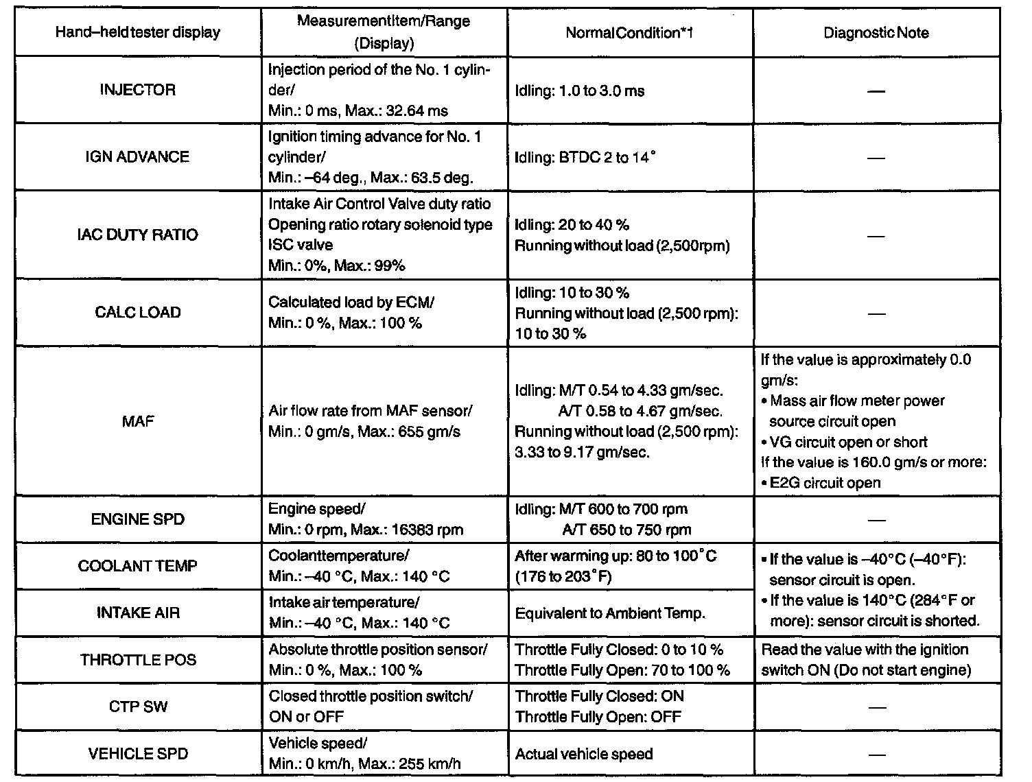 DATA LISTHINT: Using the DATA LIST displayed by the hand-held tester or the OBD II scan tool, you can read the value of the switches, sensors, actuators and so on without parts removal. Reading the DATA LIST as a first step of troubleshooting is one method to shorten diagnostic time.