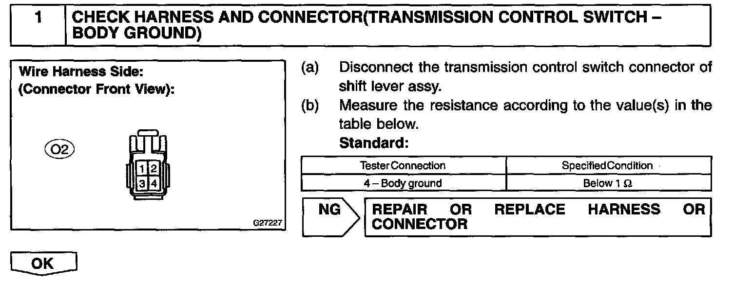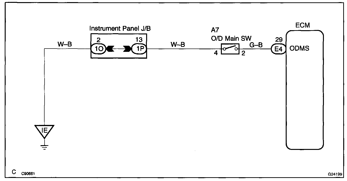 CIRCUIT DESCRIPTIONThe O/D main switch (transmission control switch) is a momentary type switch. When pressing the O/D main switch, the O/D OFF indicator light lights up and the ECM prohibits shifting into O/D, and when pressing it once again, the O/D OFF indicator light goes off and the ECM allows shifting into O/D. Turning the IG switch OFF will reset the O/D OFF indicator light.