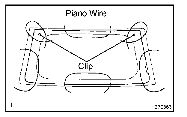 a. From the interior, insert piano wines between the vehicle body and glass, as shown in the illustration.
