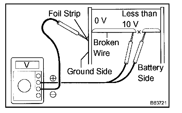 HINT: If the defogger wire is not broken, the voltmeter indicates 0 V at the positive (+) end of the defogger wire but gradually increases to approximately 12 V as the meter probe moves to the other end.