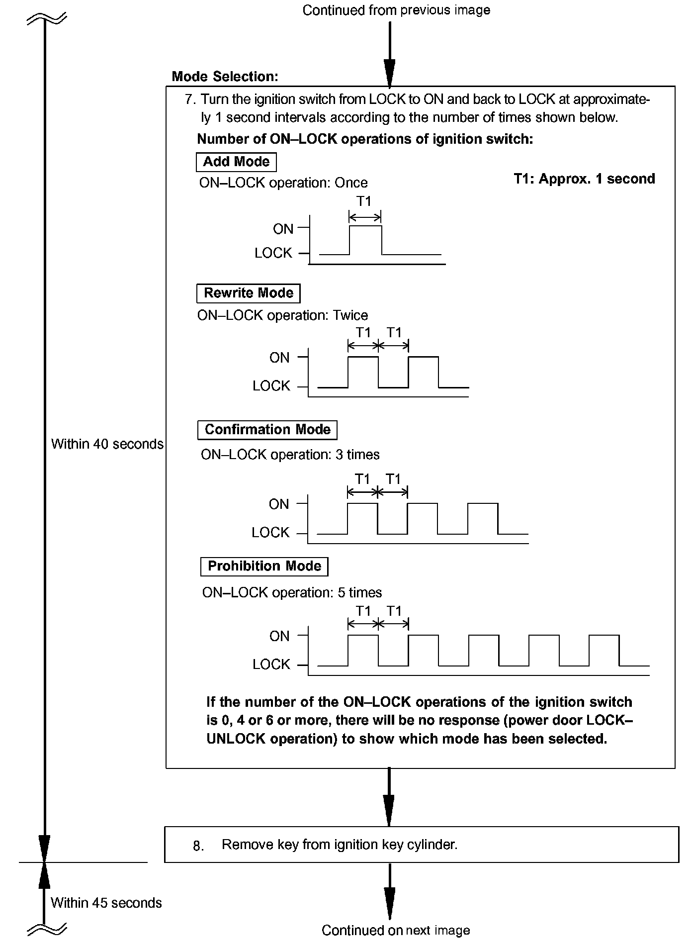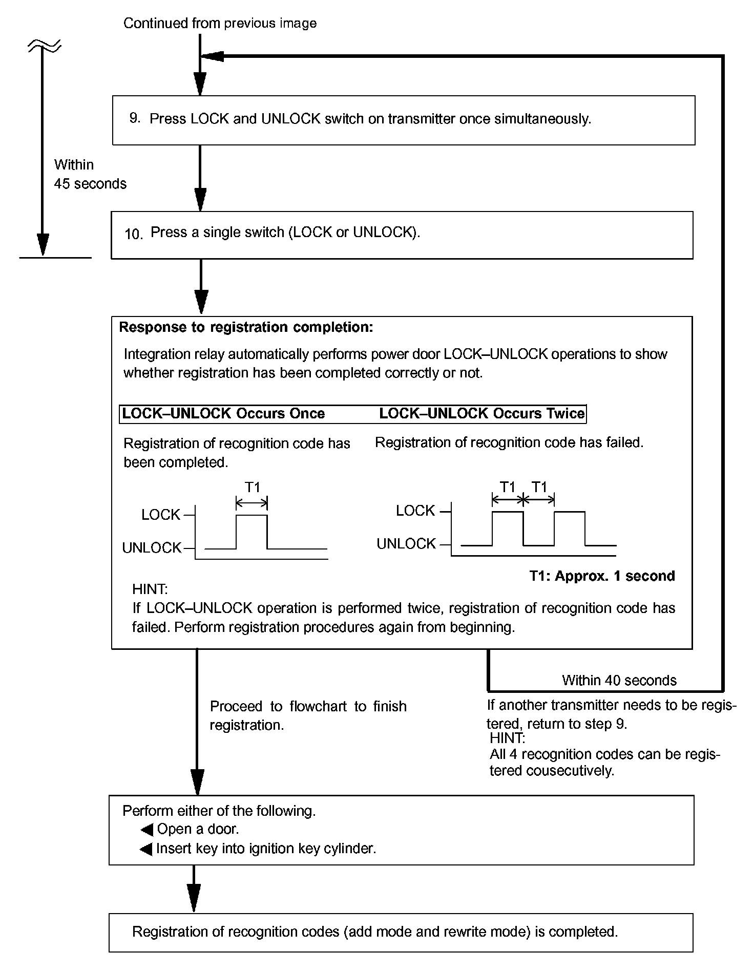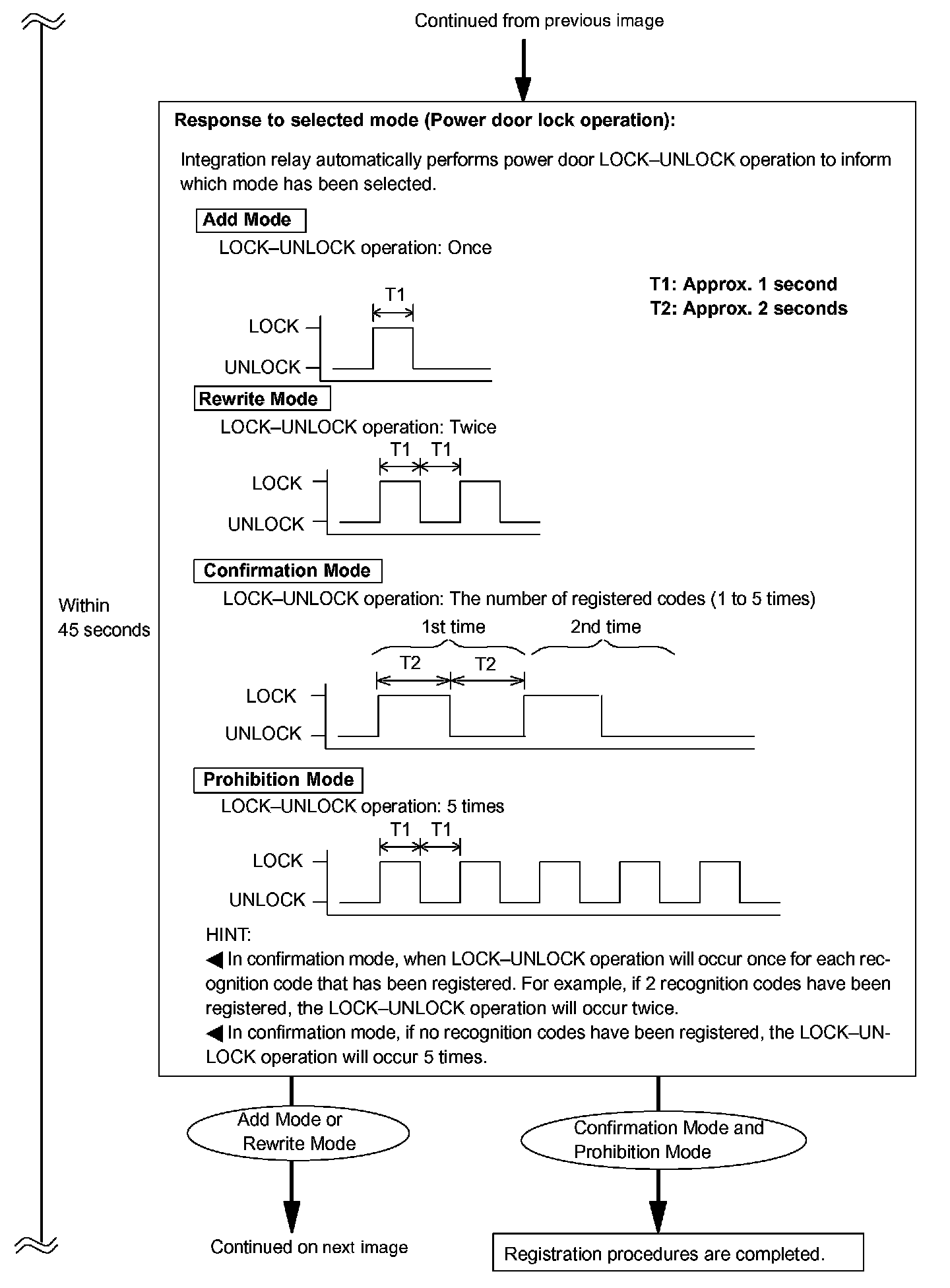 - Add mode is used to register new recognition codes while still retaining codes already registered. This mode is used when a new transmitter is added. If the number of registered codes exceeds 4, the previously registered codes will be erased in order, starting from the code that was registered first.