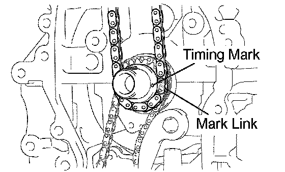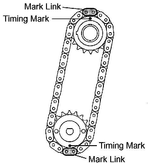 b. Install the chain onto the crankshaft timing gear with the gold or orange mark link aligned with the timing mark on the crankshaft timing gear.