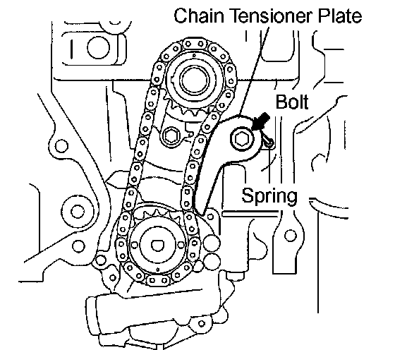 c. Remove the bolt, then remove the chain tensioner plate and spring.
