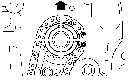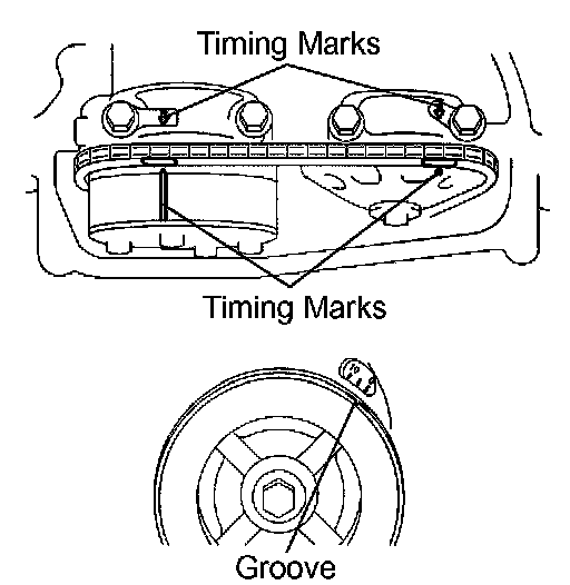 1. Turn the camshafts with a wrench on the hexagonal lobe to align the timing marks of the camshaft timing gear with each timing mark located on the No. 1 and No. 2 bearing caps as shown in the illustration.
