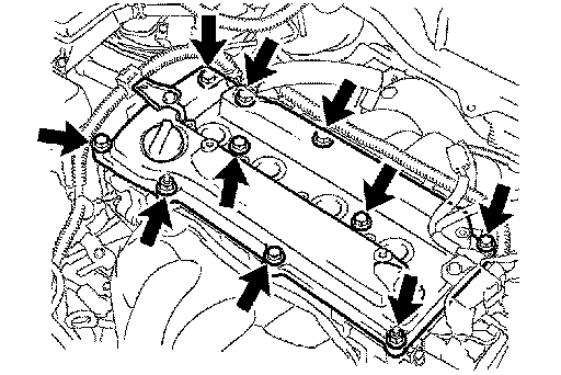 d. Remove the 8 bolts and 2 nuts, then remove the cylinder head cover.