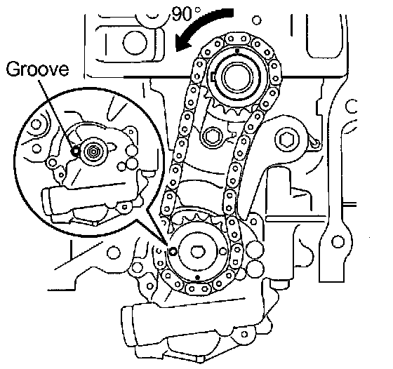 a. Turn the crankshaft by 90° counterclockwise to align the adjusting hole of the oil pump drive shaft gear with the groove of the oil pomp.
