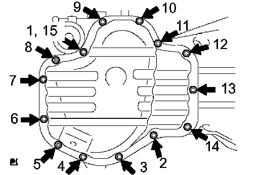 d. Uniformly tighten the 12 bolts and 2 nuts in the sequence shown in the illustration.