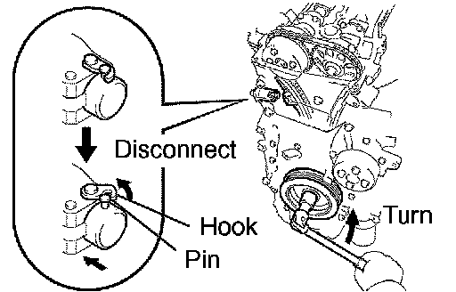 b. Turn the crankshaft counterclockwise, then disconnect the plunger knock pin from the hook.