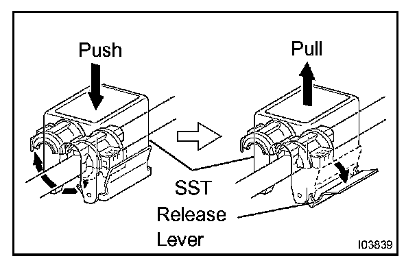 c. Pull SST slightly and push the release lever, and then remove the piping clamp with SST.