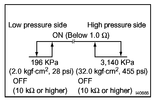 e. Check that the continuity between terminals 2 and 3 changes in accordance with the refrigerant pressure as shown in the illustration on the left.