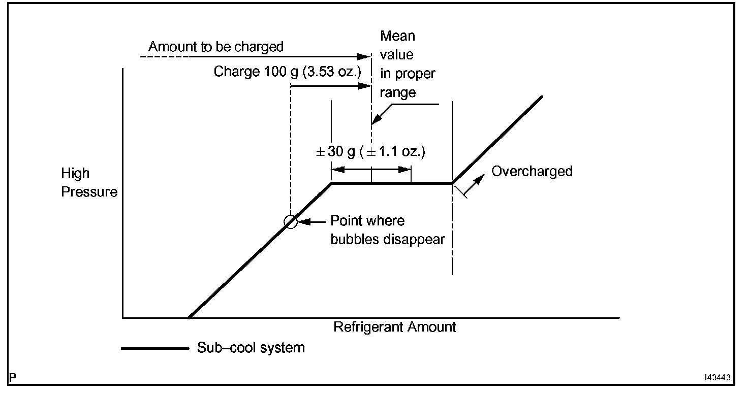 - Approximately 100 g (3.53 oz.) of refrigerant may need to be charged after bubbles disappear. The refrigerant amount should be checked by quantity, and not with the sight glass.