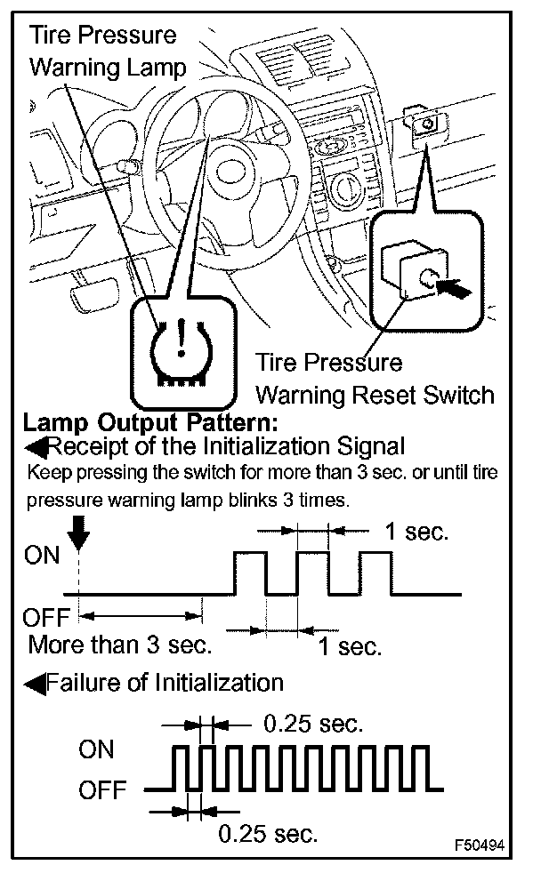 HINT: If the tire pressure warning lamp blinks at 0.25 second intervals while the vehicle is being driven, initialization may have failed. If so, perform the initialization again. (Turn the ignition switch off and retry from step 1-(a).)