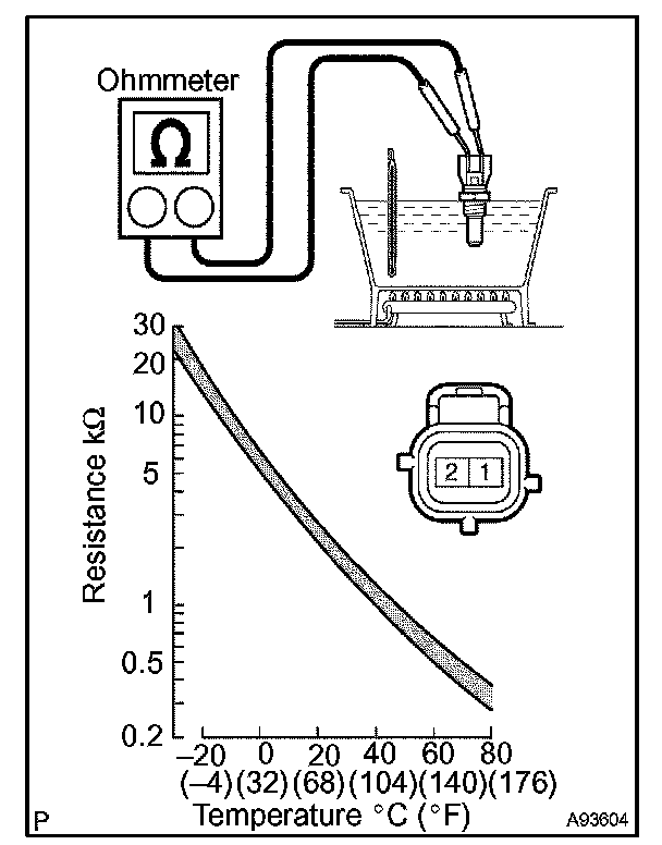 NOTE: If checking the engine coolant temperature sensor in water, be careful not to allow water to intrude into the terminals. After checking, wipe the water off the engine coolant temperature sensor.