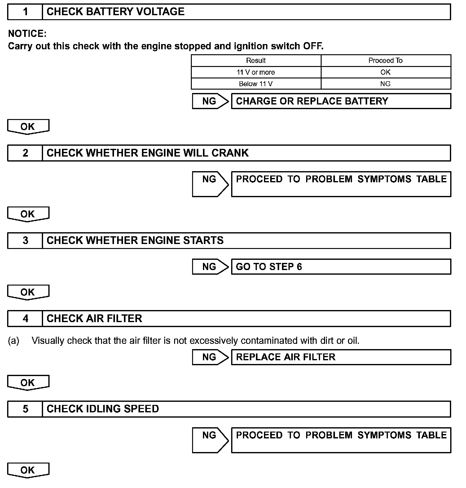 BASIC INSPECTIONWhen a malfunction is not confirmed by the DTC check, troubleshooting should be carried out in all circuits considered to be possible causes of the problem. In many cases, by carrying out the basic engine check shown in the following flowchart, the location of the problem can be found quickly and efficiently. Therefore, using this check is essential when engine troubleshooting.