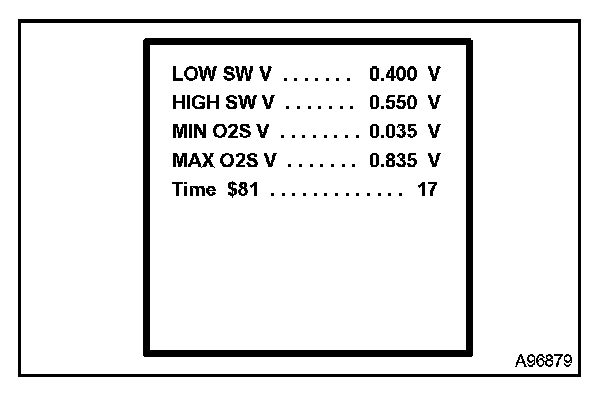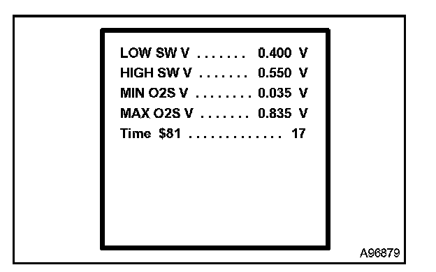 NOTE: Until the HO2 sensor monitor runs to completion, when it fails to complete or when the ignition switch is turned to OFF, the tester screen displays the upper and lower viewable limit values for the monitor (for example, voltages: 0 V and 1.275 V, seconds: 0 and 10.2, and Test Value: 0 and 255).