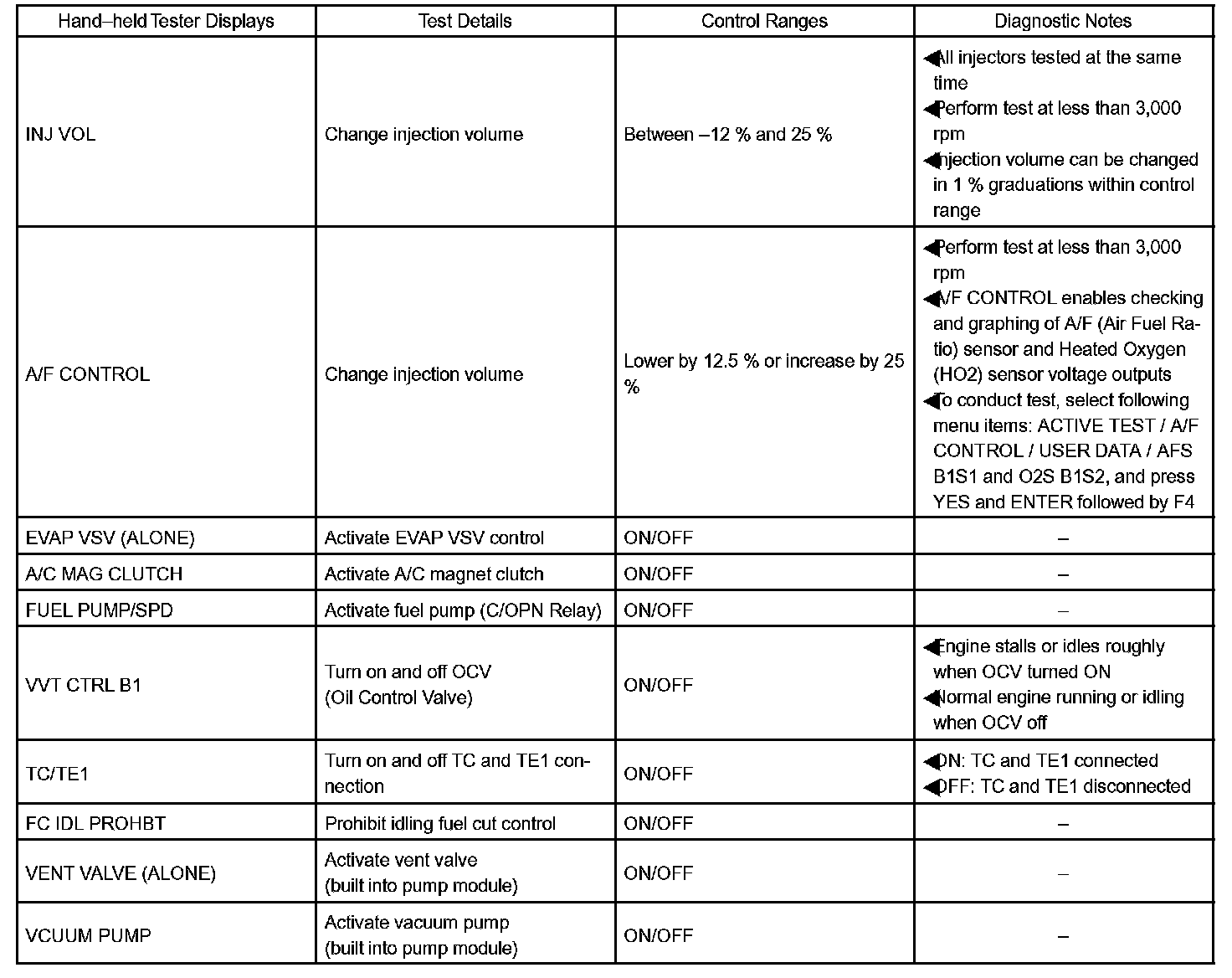 HINT: Performing an ACTIVE TEST enables components including the relays, VSV (Vacuum Switching Valve), and actuators, to be operated without removing any parts. The ACTIVE TEST can be performed with a hand-held tester. Performing an ACTIVE TEST as the first step of troubleshooting is one method of shortening diagnostic time.