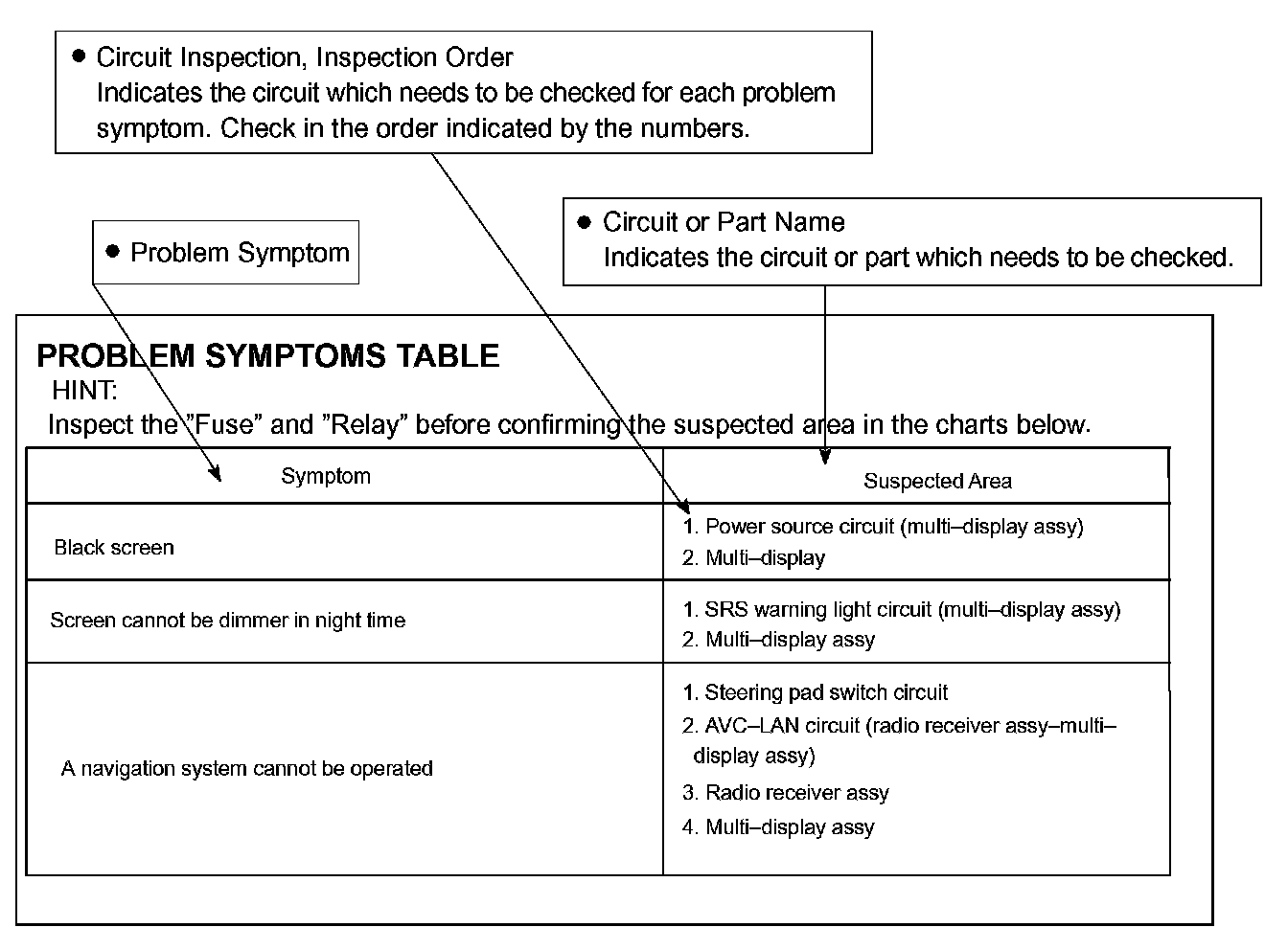 PROBLEM SYMPTOMS TABLEThe suspected circuits or parts for each problem symptom are shown in the table below. Use this table to troubleshoot when, during a DTC check, a "Normal" code is displayed but the problem is still occurring. Numbers in the table show the inspection order in which the circuits or parts should be checked.