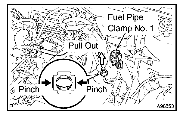 b. Pinch the retainer as illustrated, then pull the fuel tube connector out of the pipe.
