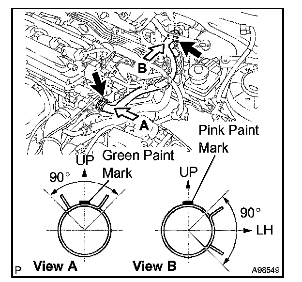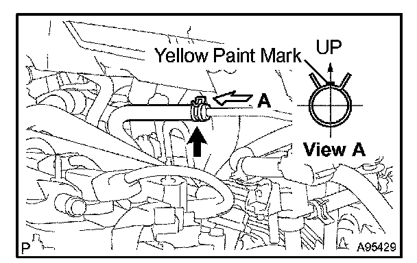 NOTE: Make sure that the paint mark and hose clamp are at the correct angle when installing.