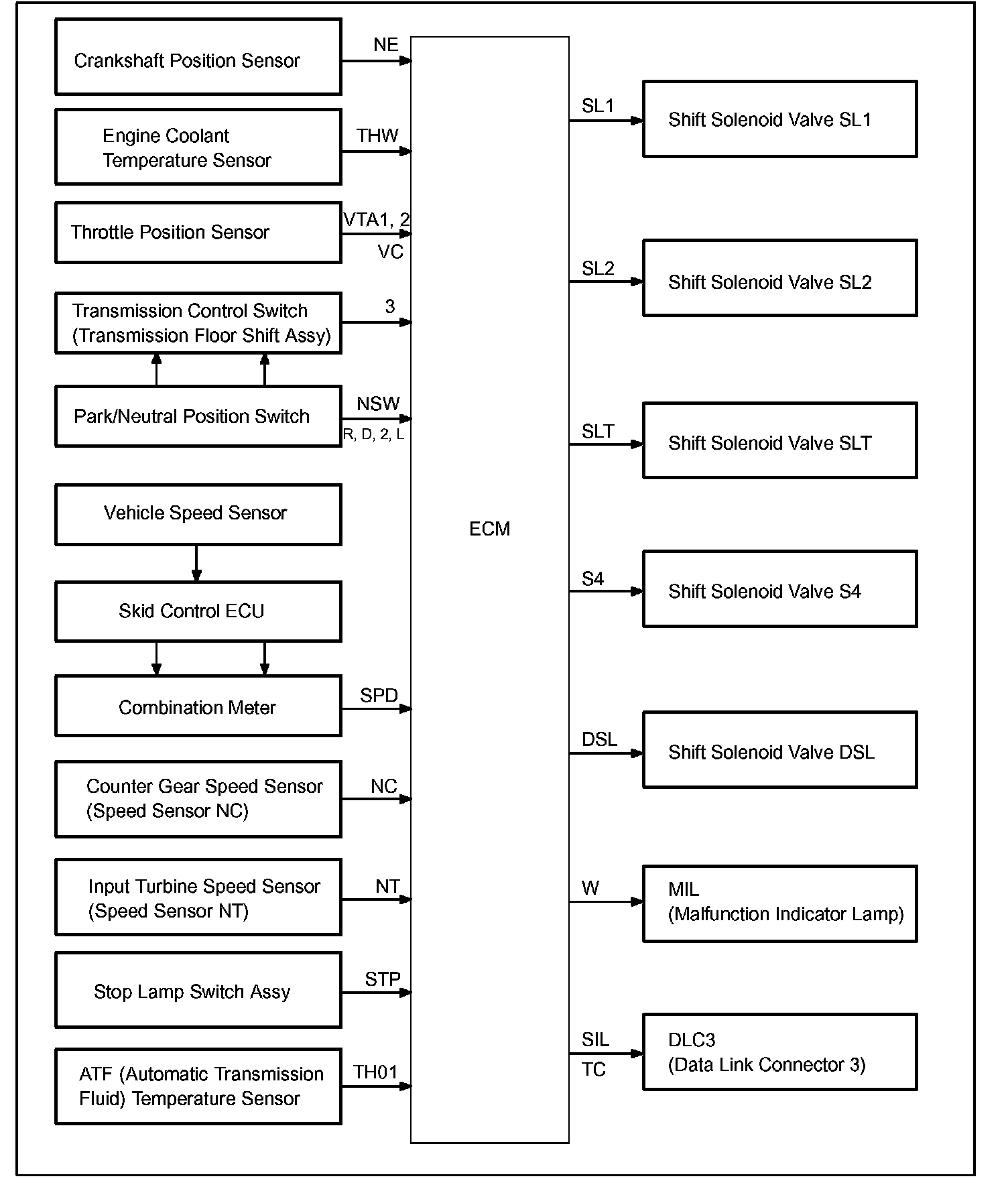 The configuration of the electronic control system in the U241E automatic transaxles is as shown in the following chart.