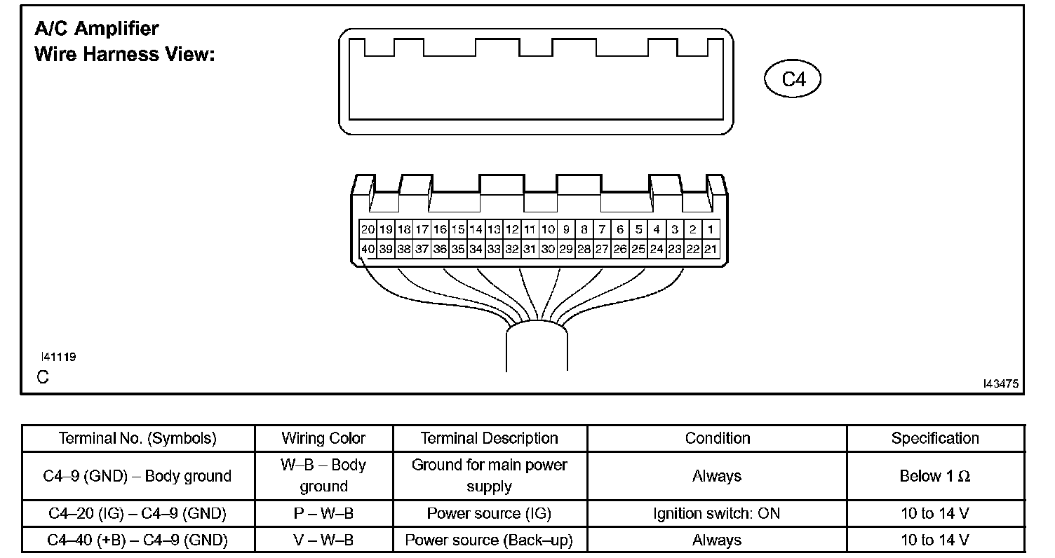 1. INSPECT AIR CONDITIONING AMPLIFIER ASSEMBLYa. Disconnect the connector from the air conditioning amplifier assembly and inspect the connector on the wire harness side, as shown in the table.