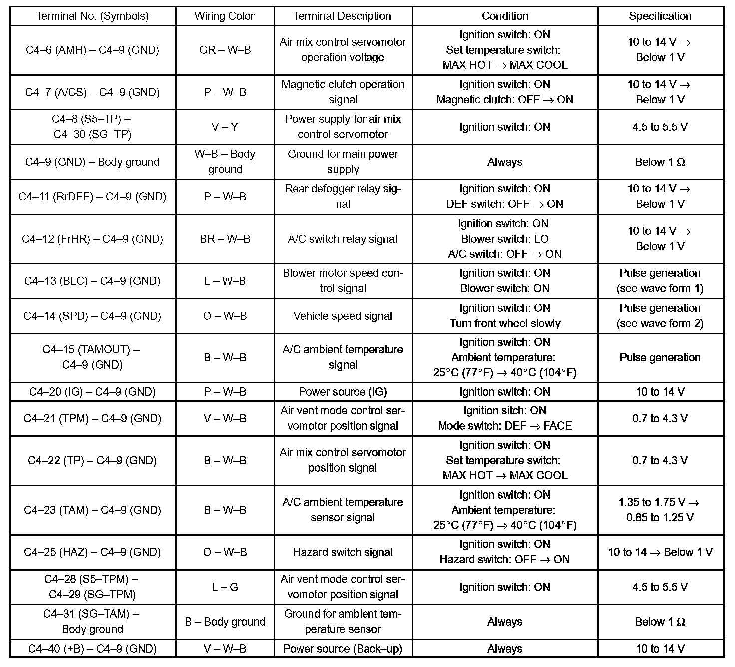b. Connect the connector to the air conditioning amplifier assembly and inspect the wire harness side connector from the back side, as shown in the table.