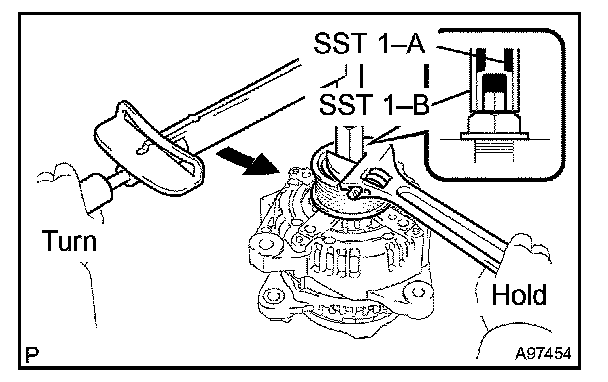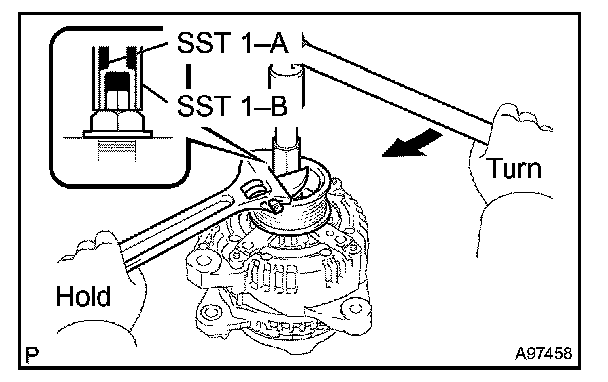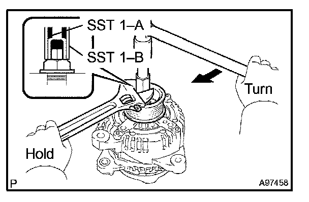 e. Turn SST 1-A in the direction shown, then loosen the generator pulley nut.