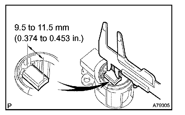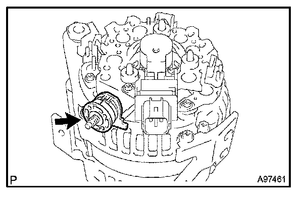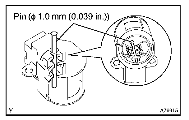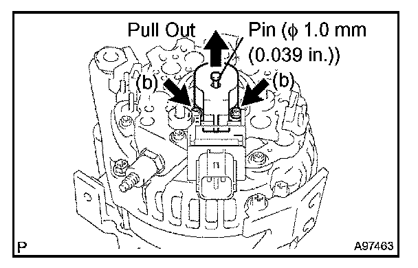 a. While pushing the 2 brushes into the generator brush holder, insert a pin (Dia 1.0 mm (0.039 in.)) into the generator brush holder.