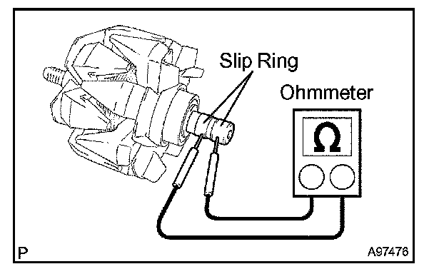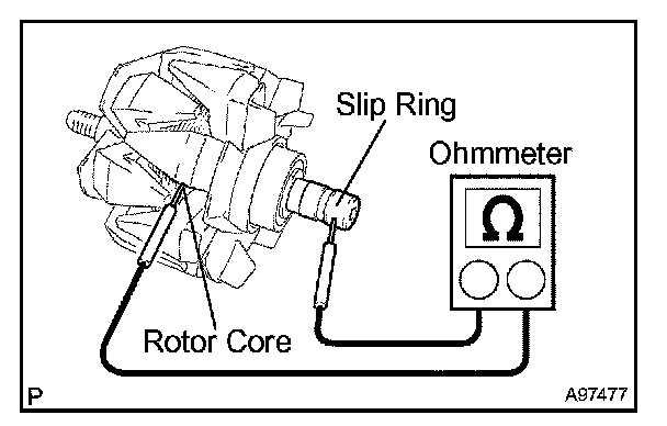 2. Using an ohmmeter, measure the resistance between the slip ring and rotor core.