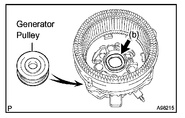 a. Install the generator pulley onto the generator rotor shaft, then temporarily tighten the generator pulley nut by hand.