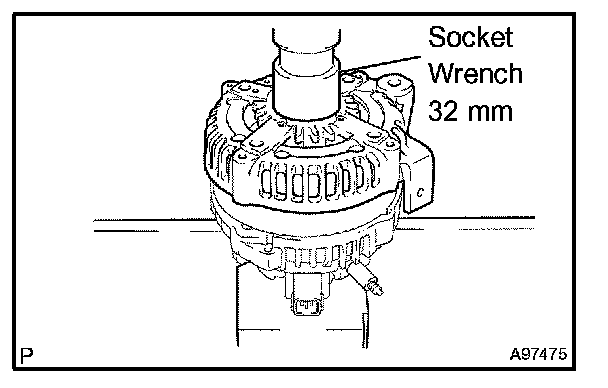 d. Using a 32 mm socket wrench and press, slowly push the generator drive end frame onto the generator rectifier end frame.