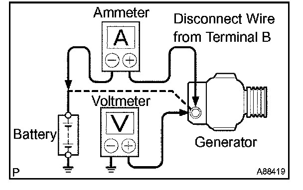 1. Disconnect the wire from terminal B of the generator, then connect it to the negative (-) lead of the ammeter.